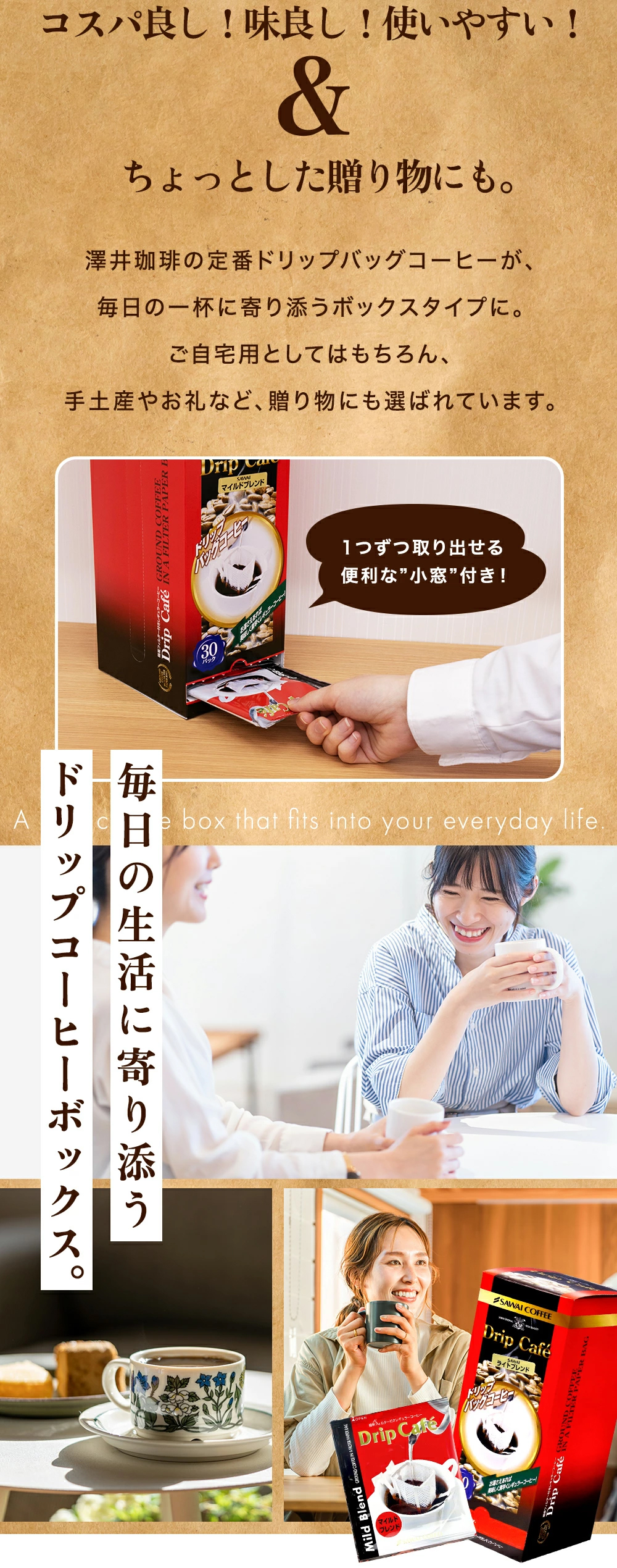| 澤井珈琲をいつもご利用いただいている方はもちろん、 「初めてだけど、まずは定番から試したい」という方にも、おすすめのドリップコーヒーです。 こちらの商品は、そのまま贈れるBOXに入っています。 1箱30袋入りで、毎日飲めるちょうどいいボリューム。 箱の下部には便利な「取り出し小窓付き」なので、キッチンやオフィスにそのまま置いて、飲みたい時にさっと取り出せます。 「自分用に」「ちょっとした贈り物に」ぜひご利用ください。 |