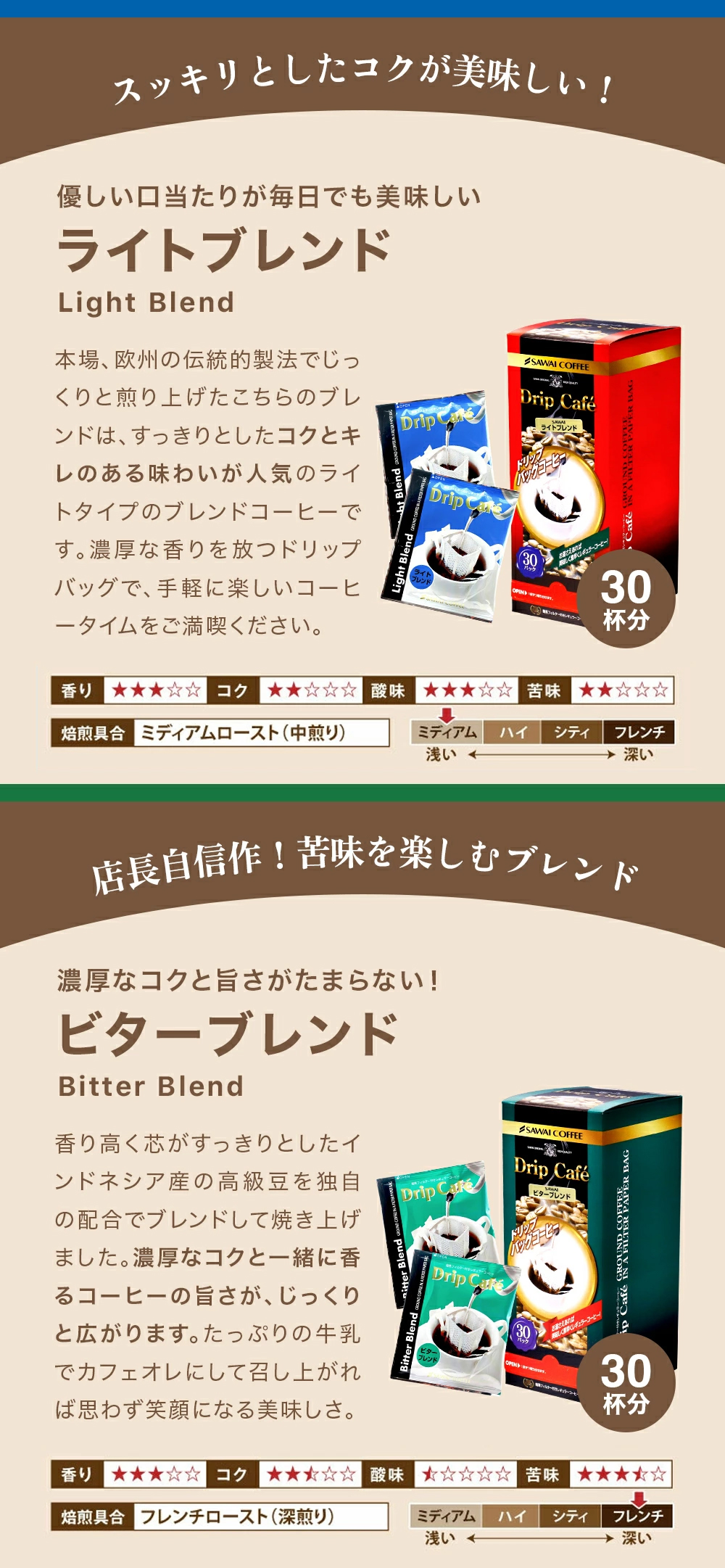 | 産地 | 【マイルドブレンド・ライトブレンド】ブラジル、コロンビア他 【ビターブレンド】ブラジル、インドネシア他 |