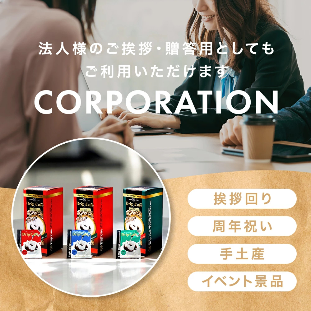 Q. 法人での注文は可能ですか? A. はい、法人様からのご注文も承っております。挨拶回りや贈答用、イベント景品など幅広くご利用いただけます。 Q. のし・ギフト対応はできますか? 商品によって対応可能です。詳細は商品ページ内の案内、または事前にお問い合わせください。 Q. 個包装になっていますか? 1杯分ずつ「個包装」のドリップコーヒーのため、配布用にも適しています。 Q. 挨拶回り・周年祝いに使えますか? 会社のご挨拶、周年祝い、手土産、来客用として多くの企業様に選ばれています。 |